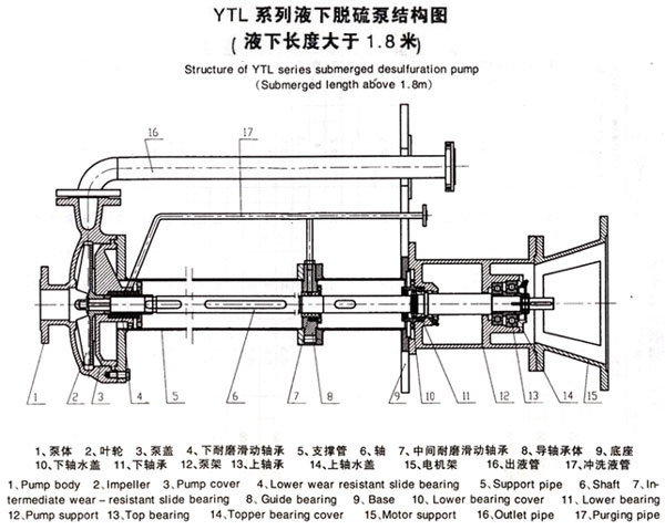 YTL系列液下脫硫泵,當(dāng)泵的液下長(zhǎng)度大于1.8米時(shí),該泵為立式長(zhǎng)軸液下離心泵,液下部分設(shè)有耐磨、耐腐蝕滑動(dòng)軸承;該結(jié)構(gòu)泵由泵體、葉